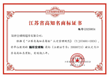 “瑞祥全球购”商标荣获“江苏省高知名商标证书”